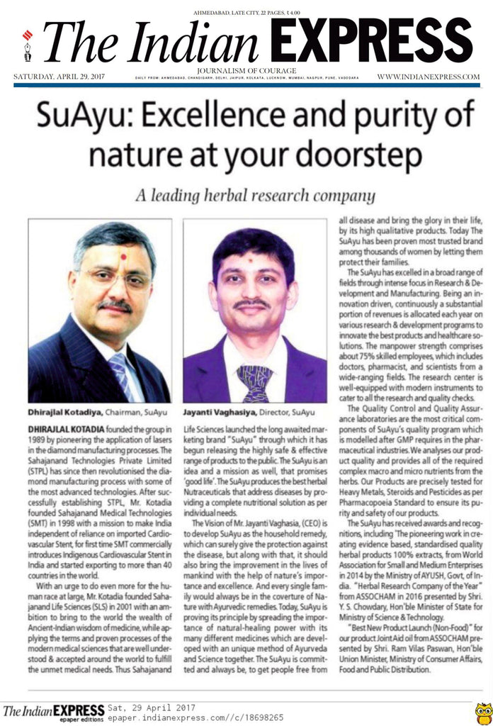 Go to the shopSuAyu was covered by a leading English newspaper "The Indian Express" on 29th April 2017 - Healthy Gujarat...