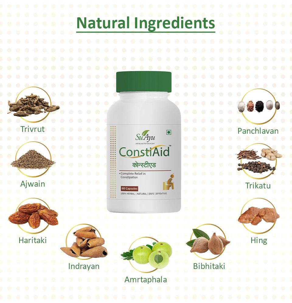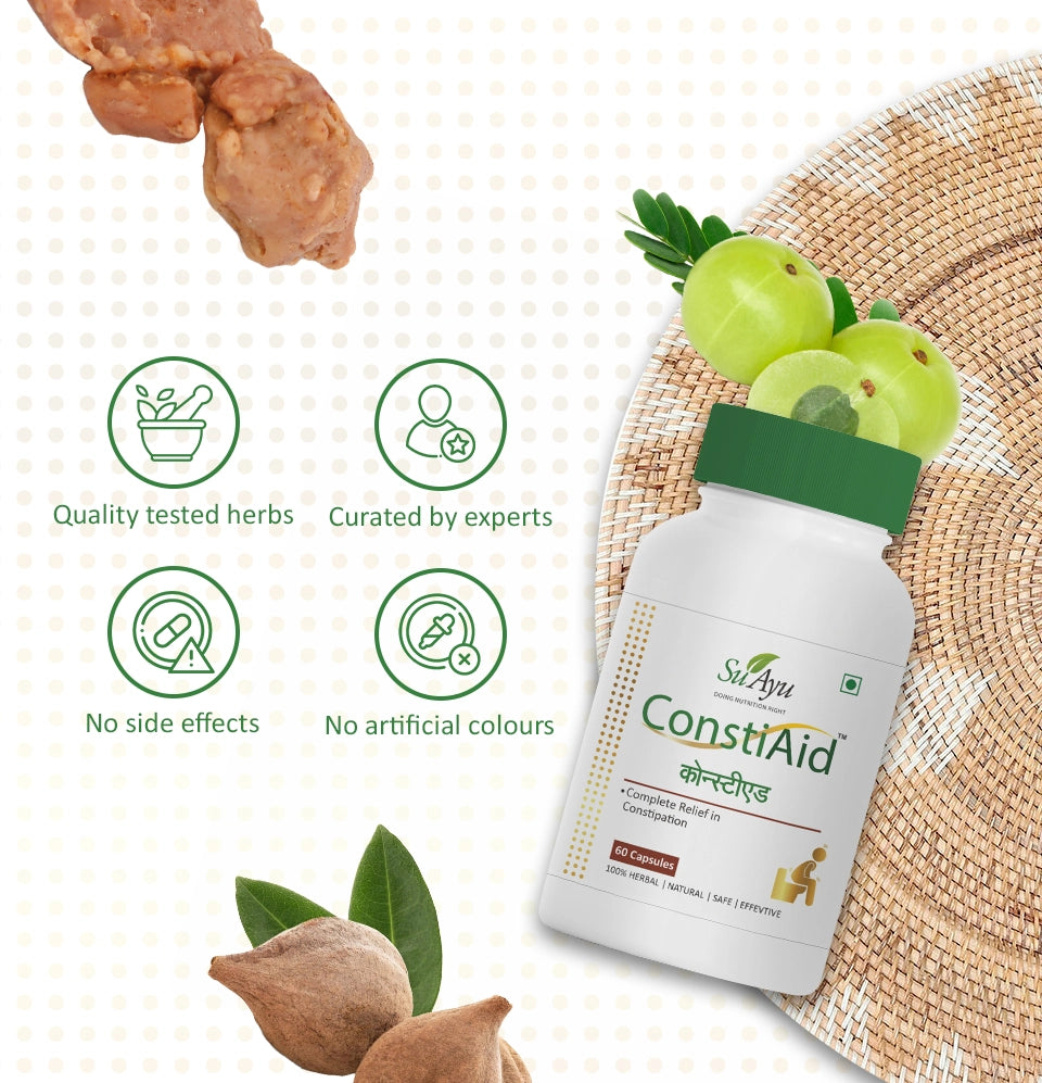 SuAyu's ConstiAid Capsule offers a natural solution for complete relief from constipation, promoting improved digestive health. Formulated with a blend of high-quality herbal extracts, this capsule works effectively to restore regular bowel function and alleviate discomfort associated with constipation.