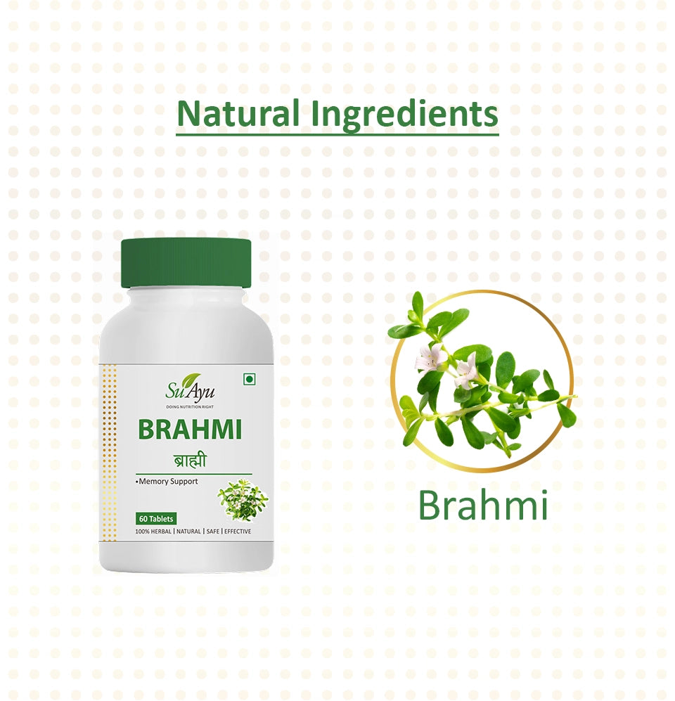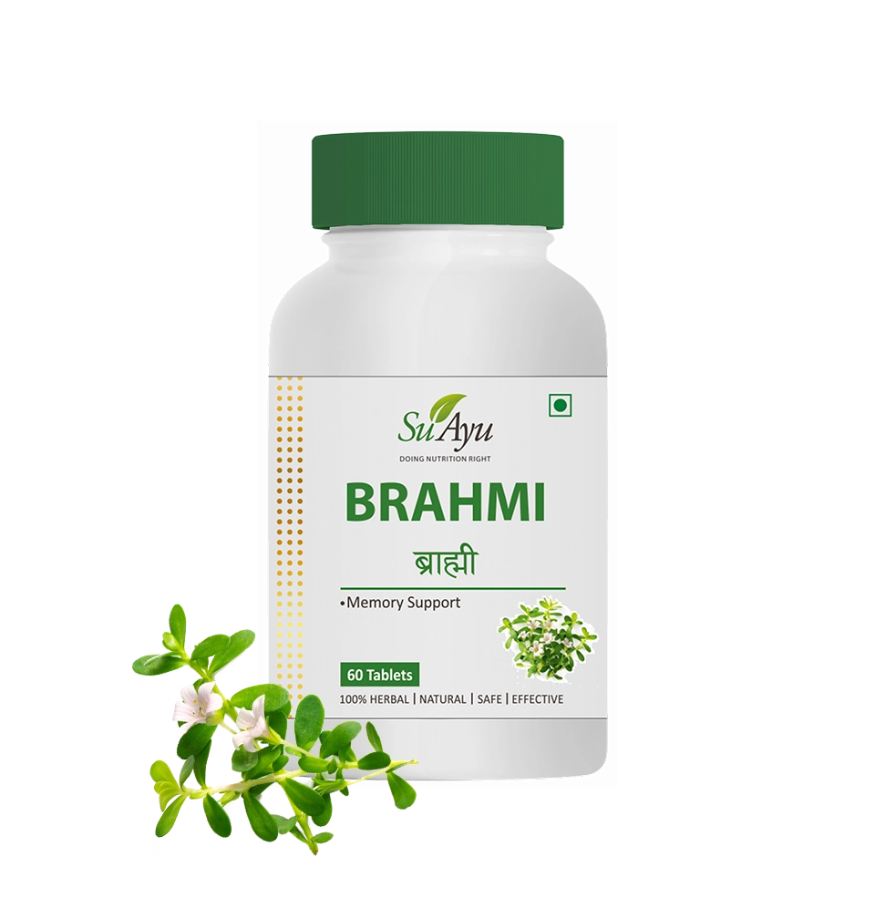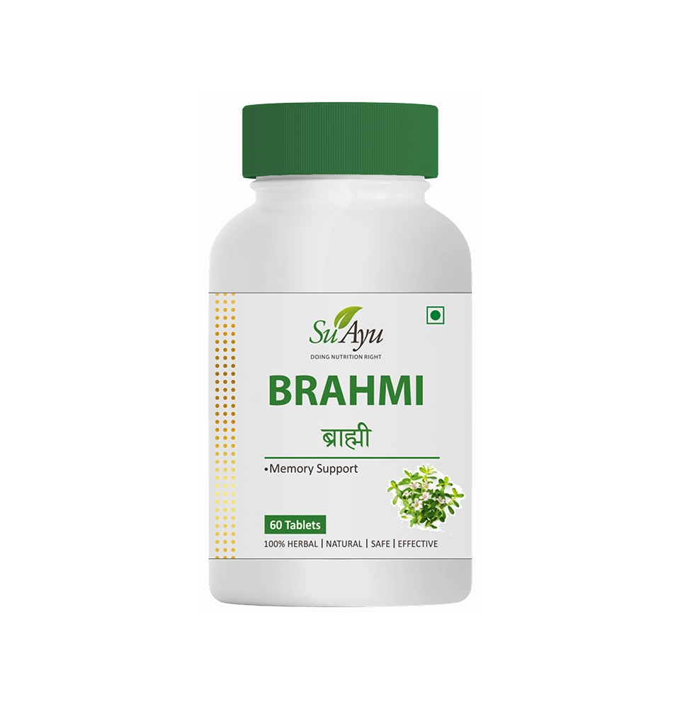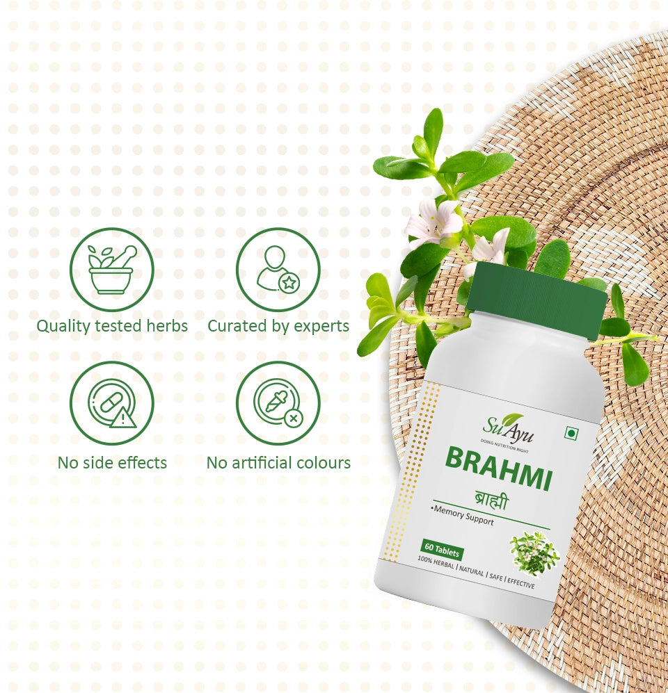 Brahmi tablets of SuAyu possess marvelous benefits of improving brain functioning and strengthening memory. Brahmi is a therapeutic herb commonly used as a memory enhancer, aphrodisiac and a tonic to reduce stress and anxiety. Brahmi has a natural cooling property which keeps mind calm and stress free therefore promoting sound sleep. Brahmi has a positive impact on the hippocampus region of the brain which improves concentration, intelligence and memory. Brahmi improves working memory, mental-agility and learning ability in young adults, students, working professionals and elderly as well. This herb is also helpful in preventing age-associated memory problems in middle aged and older people.