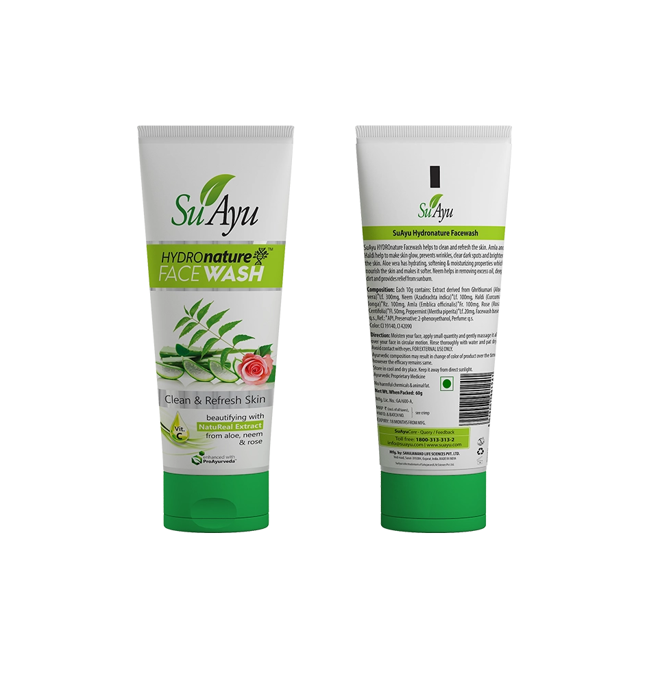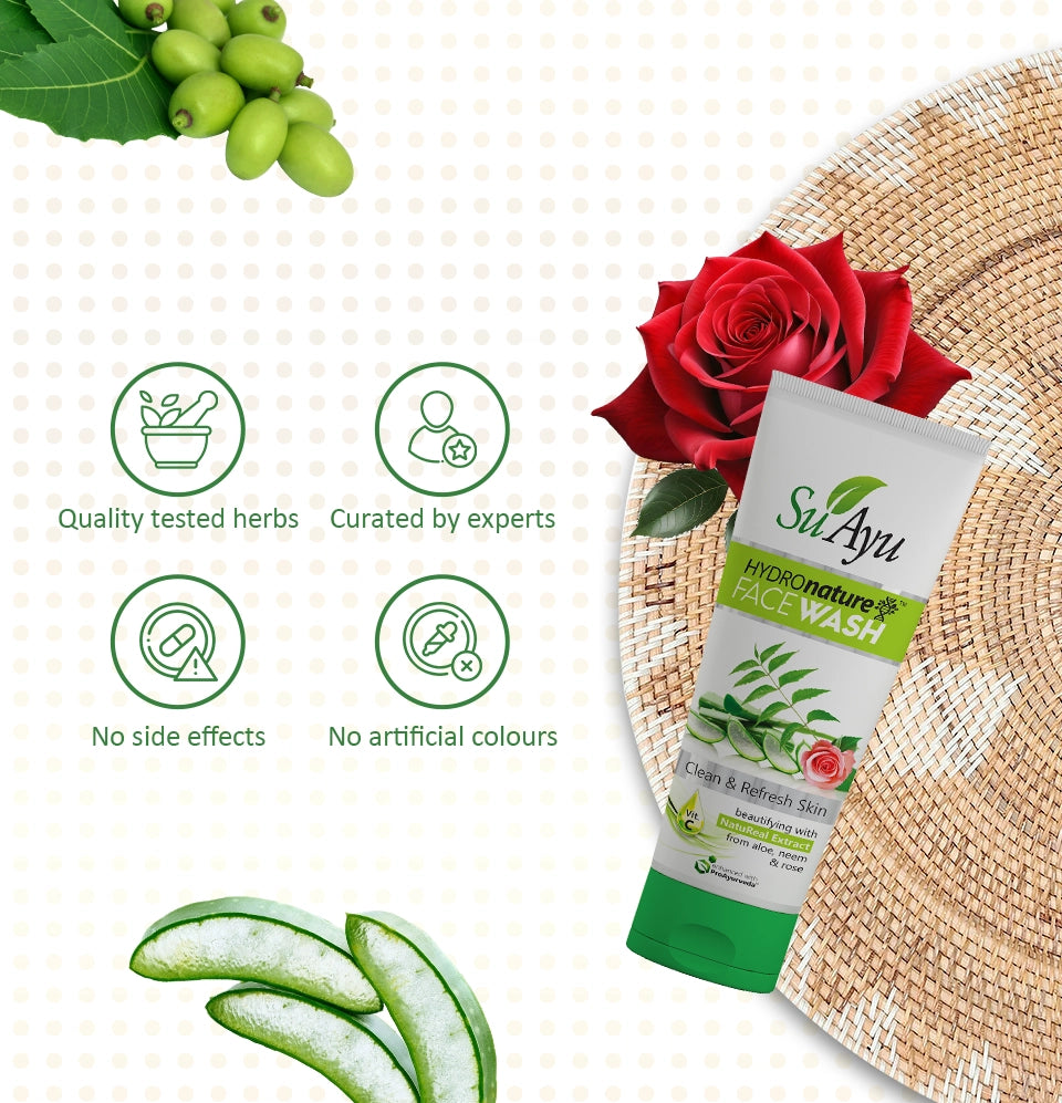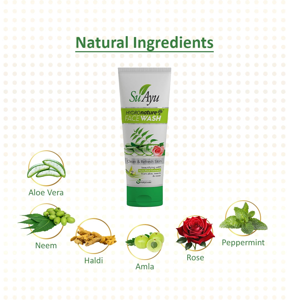 SuAyu HydroNature face wash helps to clean and refresh the skin. Amla and haldi help to make skin glow, prevent wrinkles, clear dark spots and brighten the skin. Aloe vera has hydrating, softening and moisturizing properties which nourish the skin and makes it softer Neem helps in removing excess oil, deep dirt and provides relief from sunburn.