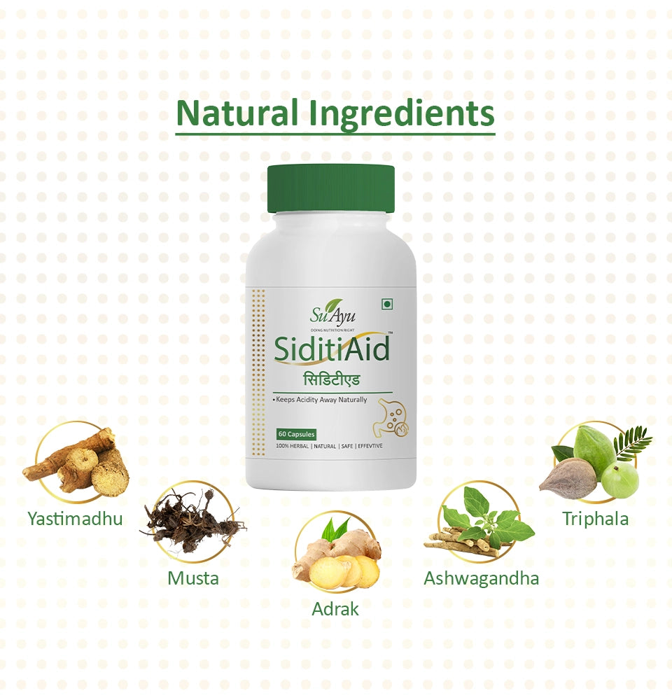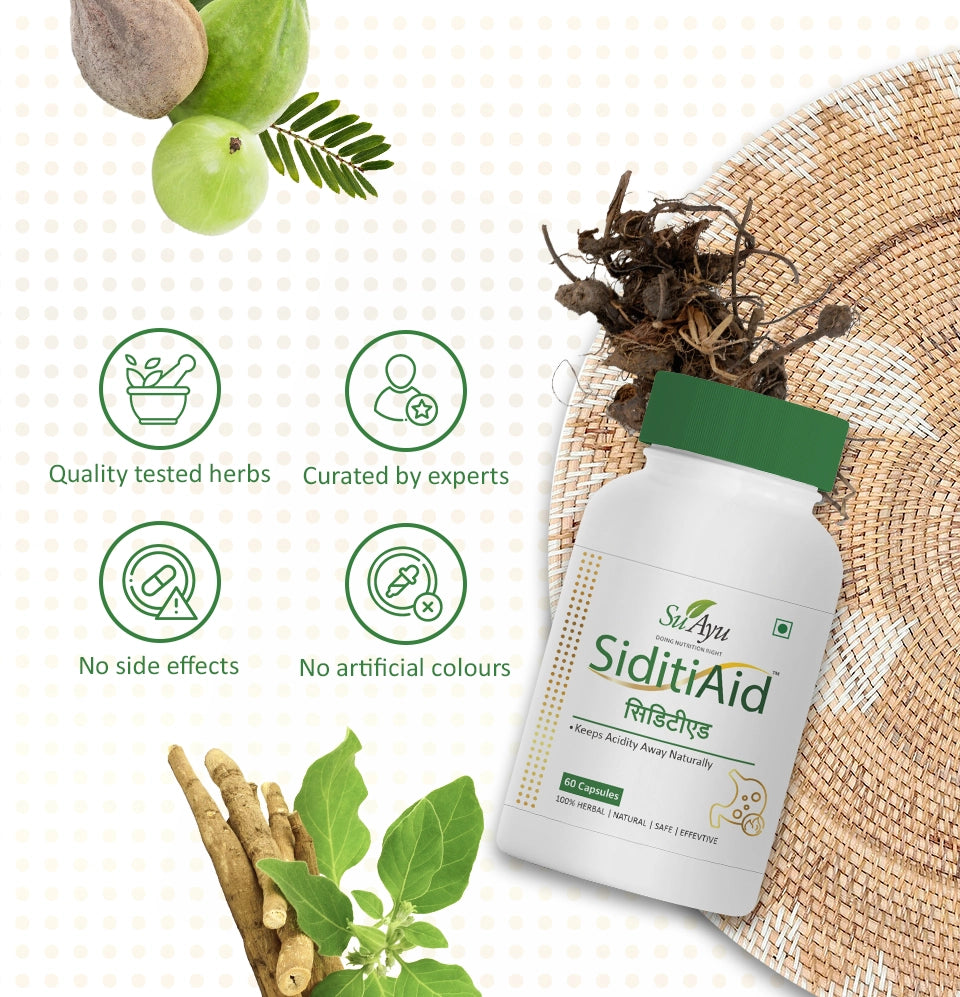 SuAyu's SiditiAid Capsule is a natural solution designed to help manage acidity and promote a comfortable digestive experience. Formulated with high-quality herbal extracts, this capsule works to balance stomach acid levels and reduce discomfort caused by acidity. Its natural ingredients are carefully selected to support digestive health and maintain overall well-being. Tested to meet international safety standards, SiditiAid Capsule is free from heavy metals, steroids, and pesticides, ensuring both safety and effectiveness for your digestive needs.