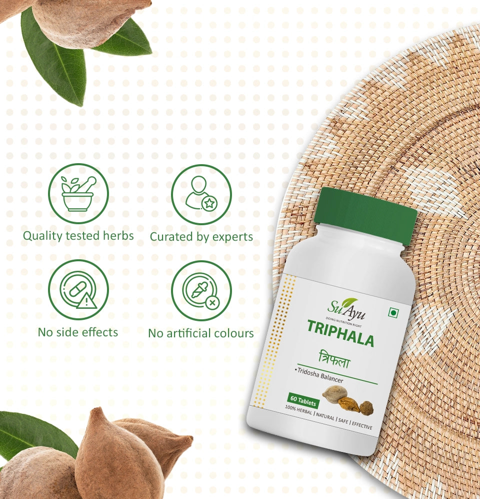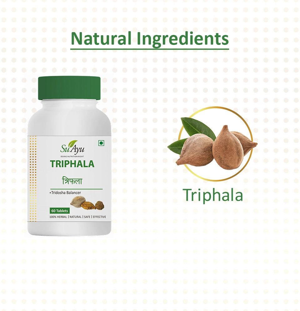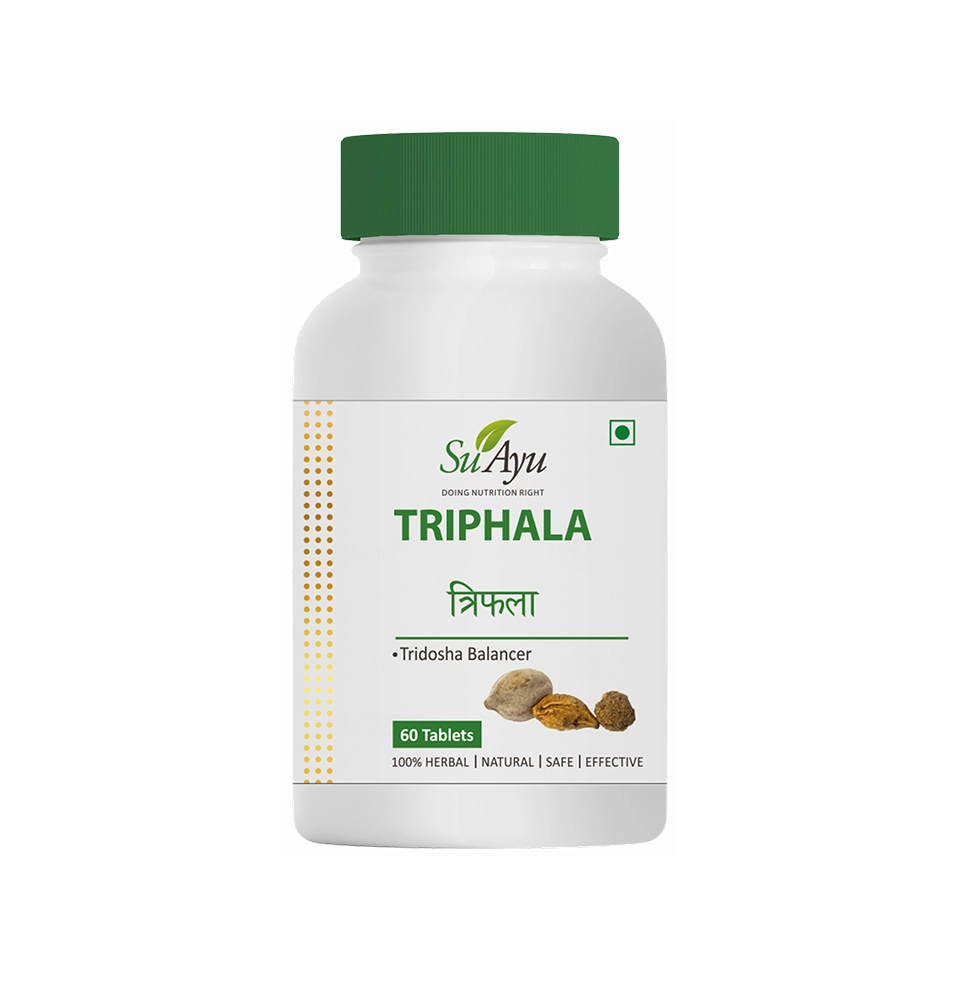 SuAyu’s Triphala tablets are not a single herb but a wonderful combination of 3 highly effective herbs; Amla, Baheda and Haritaki. In Ayurveda, Triphala is called “Nectar of Life” because it possesses tremendous healing properties. Triphala is called Tridosha balancer because it helps maintain Vata, Pitta and Kapha dosha in the body, acting as a metabolism regulator. It is a natural antioxidant helping in Weight loss, indigestion, IBS, constipation, maintains healthy Cholesterol levels, has Antibacterial and Antiviral properties. It is highly effective in improving eyesight. It promotes healthy immunity levels in the body which helps combat infections and inflammation. It brings natural glow to the skin, fighting off Acne, eczema and other skin allergies.